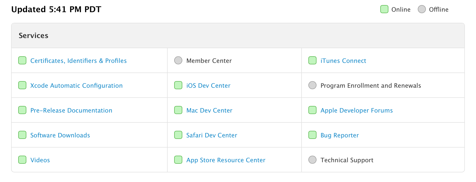 We sincerely appreciate your patience as we work to bring our developer program services back online, and we want to give you an update on our progress. The majority of our developer services are currently online, including Certificates, Identifiers & Profiles, Dev Centers, software downloads, Videos, Apple Developer Forums, iTunes Connect, Bug Reporter, App Store Resource Center, and access to pre-release documentation.