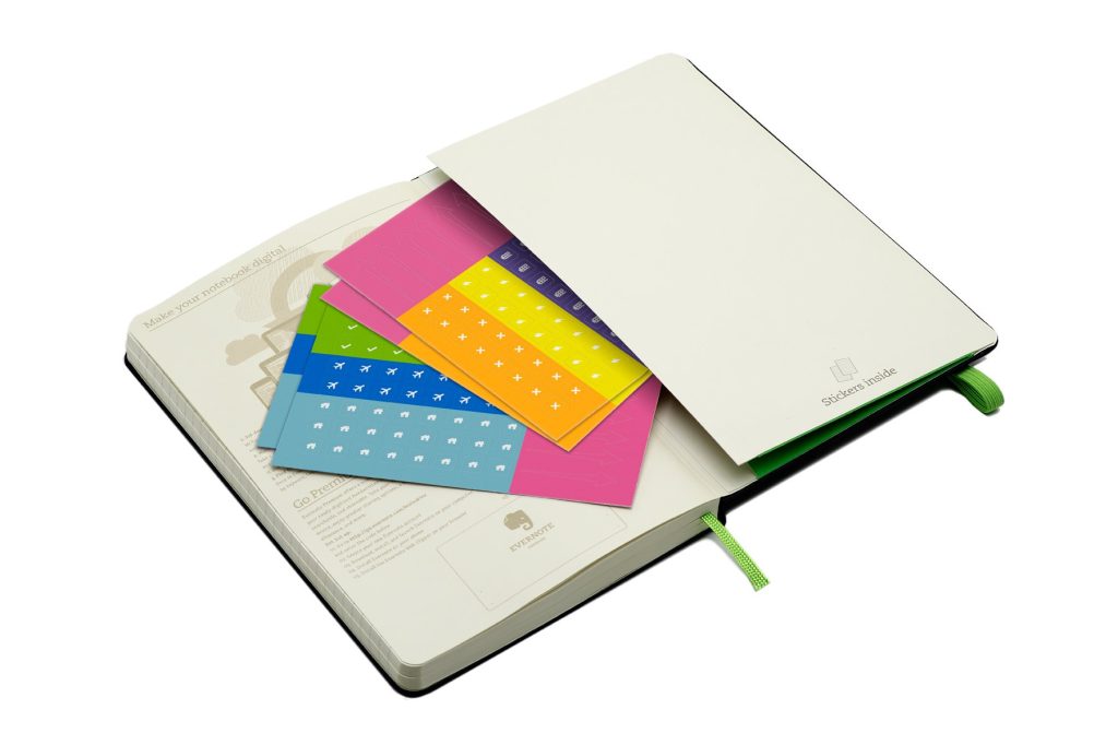 As for Evernote Moleskine planner, you can “Think and create on paper, save and share in the cloud with Evernote. The Evernote Planner Weekly Notebook by Moleskine uses Evernote’s Page Camera feature to capture the pages of your notebook with your smartphone or tablet. Once in you’ve uploaded to Evernote, you can search for your handwritten notes by keyword, tag or just visually browse. Includes 3-month Evernote Premium subscription and four pages of Smart Stickers.”