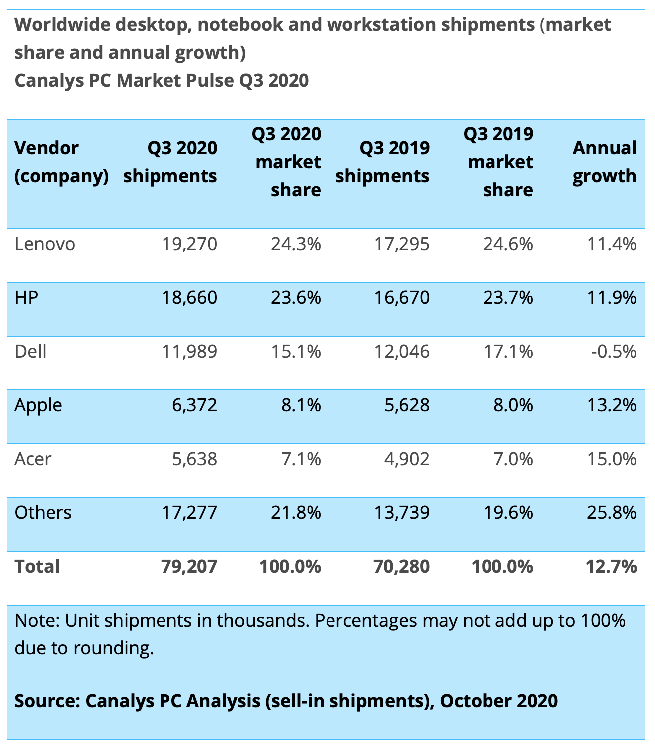 The latest analysis from Canalys shows that the global PC market saw growth of 12.7% for Q3, shipping a total of 79.2 million computers driven by more people working from home and students heading back to school virtually.
