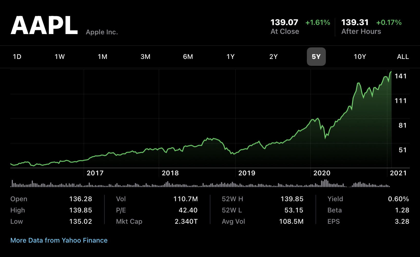 AAPL’s value hasn’t moved much since the end of 2020. On December 29, we saw Apple shares hit $138.78 in intraday trading with the stock seeing an almost 90% gain across 2020. Even so, today’s slight gain of 1.61% was enough to move AAPL to a new all-time high as it closed at $139.07.