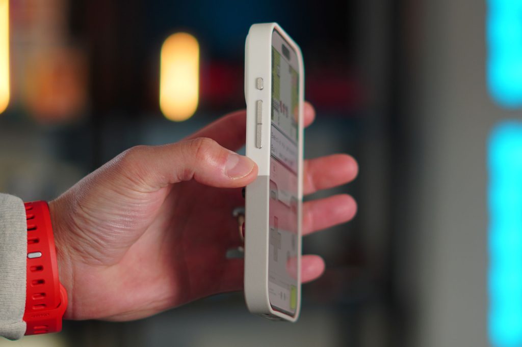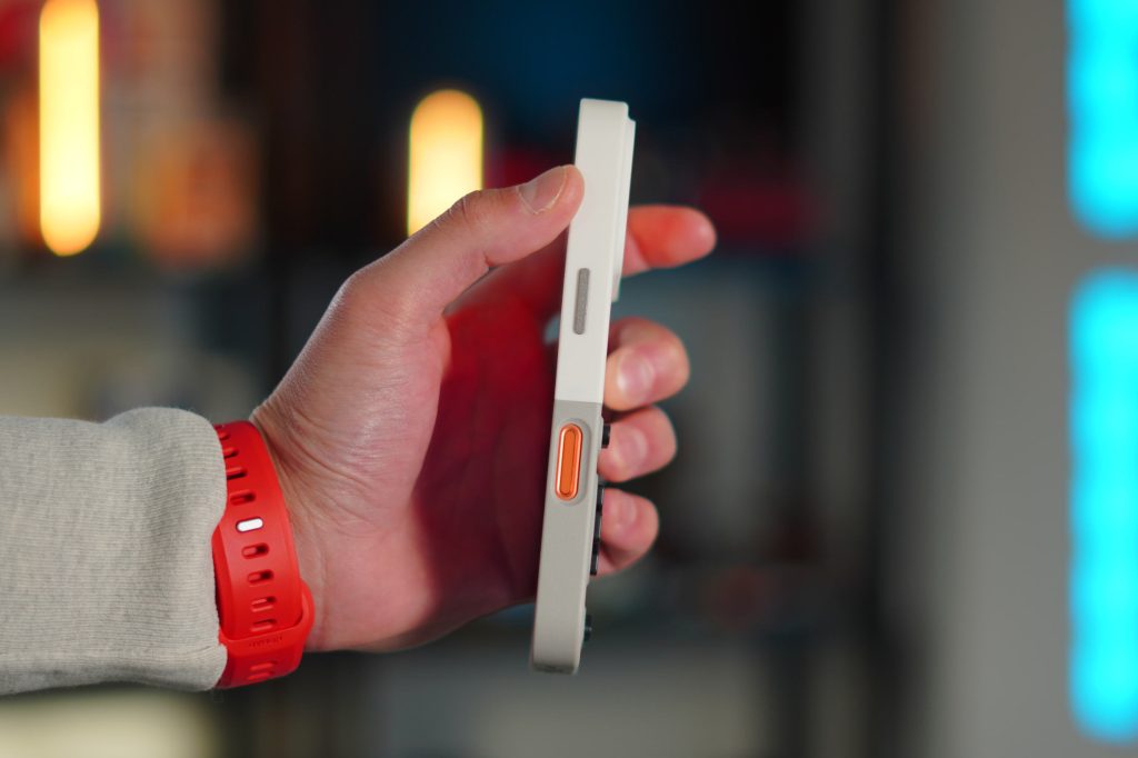 The design of the case is what really draws you in. The case is a two-piece design that snaps together. A regular protective case on top with a camera plateau cut out and a camera lip, and a flip-to-play button panel on the bottom. As a standard case, it’s completely normal. The case is slim, lightweight, and surprisingly durable, even though it’s made of plastic. When you use it as a case, it just looks like a fun, playful, and retro-inspired one. It has all the necessary cutouts for the speaker grills, the USB-C port, and the Camera Control button as well.