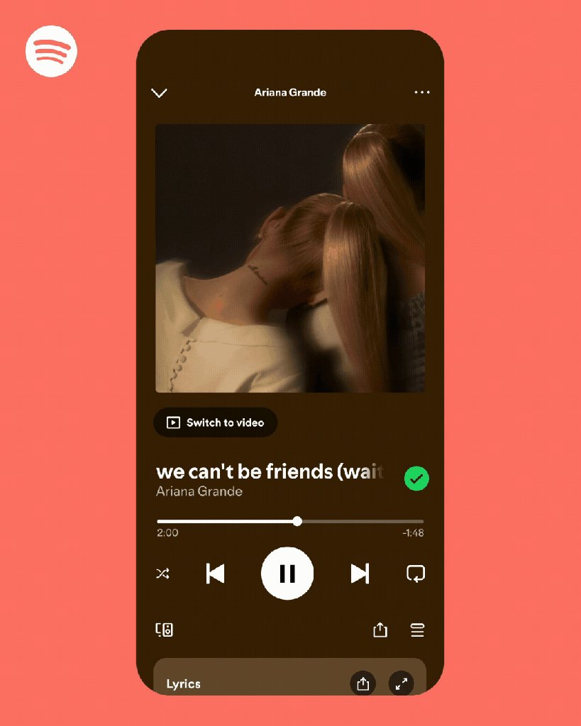 To watch music videos on Spotify, just tap, click, or select the “Switch to video” button that appears under the album or song artwork, when available. The feature is available on the Spotify app for TVs, desktops, iOS, and Android devices, with the option to watch it in full screen.