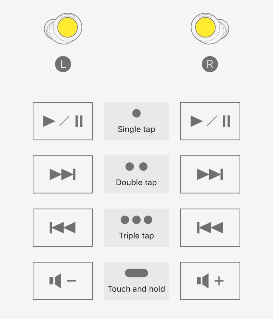 The entire outer surface of each earbud is a touchpad, and you can use the app to change the default functions available for each one.