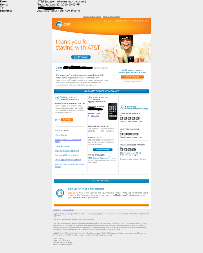 Some of our new iPhone 4 readers are getting the following emails from AT&T thanking them for staying with AT&T (as if there were a choice) and their recent purchase of an iPhone 3G. Problem is: either the email is two years late or they are thanking them for buying a two year old phone.