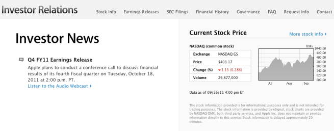 As noted by MacStories, Apple today refreshed its investor relations page with news on its Q4 2011 Earnings call.