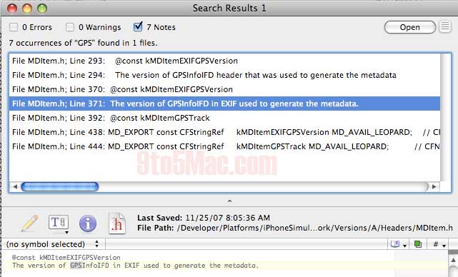While by no means conclusive evidence of GPS capabilities in the iPhone camera software, the latest builds of the SDK are littered with GPS references. Whether these are just templates (you can see other camera manufactures included as well) or needed by the 3G iPhone camera software is unknown.