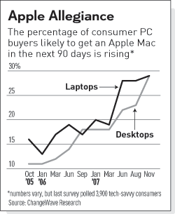 The trend line is clearly up for Apple. Two years ago, 16% of likely notebook PC buyers and 11% of desktop PC buyers planned to buy Macs. Demand for Macs has risen steadily ever since. Analysts credit the "halo effect" from the company’s popular iPod portable music players and iPhone smart phones. People that buy and like iPods and iPhones are inclined to try Macs.
